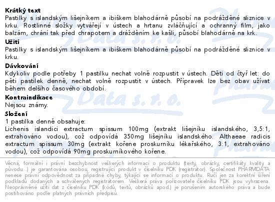 Pastilky s islandským lišejníkem a ibiškem blahodárně působí na podrážděné sliznice v krku. Rostlinné složky vytvářejí v ústech a hrtanu zvláčňující a ochranný film, jako balzám, chrání tak před chrapotem a drážděním ke kašli, působí blahodárně na krk.