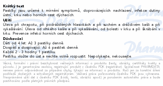 Pastilky jsou určené k mírnění symptomů, doprovázejících nachlazení, infekce dutiny ústní, krku nebo horních cest dýchacích.