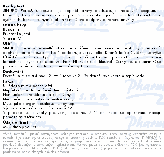 SINUPO Forte® s boswellií je doplněk stravy představující inovativní recepturu s boswellií, která podporuje zdraví plic. S prvosenkou jarní pro zdraví horních cest dýchacích, bezem černým a vitaminem C pro podporu přirozené imunity.