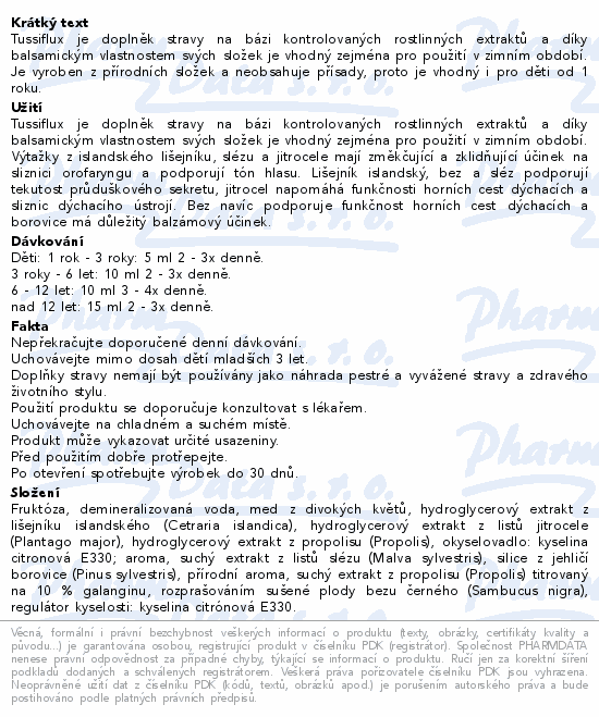 Tussiflux je doplněk stravy na bázi kontrolovaných rostlinných extraktů a díky balsamickým vlastnostem svých složek je vhodný zejména pro použití v zimním období. Je vyroben z přírodních složek a neobsahuje přísady, proto je vhodný i pro děti od 1 roku.