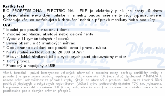 RIO PROFFESSIONAL ELECTRIC NAIL FILE je elektrický pilník na nehty. S tímto profesionálním elektrickým pilníkem na nehty budou vaše nehty vždy vypadat skvěle. Obsahuje vše, co potřebujete k zbroušení nehtů a přípravě manikúry nebo pedikúry.