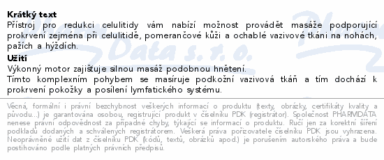 Přístroj pro redukci celulitidy vám nabízí možnost provádět masáže podporující prokrvení zejména při celulitidě, pomerančové kůži a ochablé vazivové tkáni na nohách, pažích a hýždích.