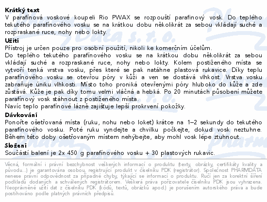 V parafínová voskové koupeli Rio PWAX se rozpouští parafinový vosk. Do teplého tekutého parafínového vosku se na krátkou dobu několikrát za sebou vkládají suché a rozpraskané ruce, nohy nebo lokty.