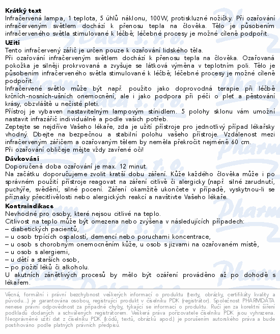 Infračervená lampa, 1 teplota, 5 úhlů náklonu, 100W, protiskluzné nožičky. Při ozařování infračerveným světlem dochází k přenosu tepla na člověka. Tělo je působením infračerveného světla stimulované k léčbě; léčebné procesy je možné cíleně podpořit.