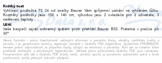Vyhřívací podložka TS 26 od značky Beurer Vám zpříjemní usínání ve vyhřátém lůžku. Rozměry podložky jsou 150 x 140 cm, výhodou jsou 2 ovladače pro 2 uživatele, 3 nastavení teploty.
