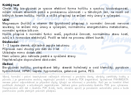Chelát Mg bis-glycinát je vysoce efektivní forma hořčíku s vysokou biodostupností, nižším rizikem střevních potíží a prokázanou účinností i u těhotných žen, na rozdíl od běžných forem hořčíku. Hořčík a vit.B6 přispívají ke snížení míry únavy a vyčerpání.