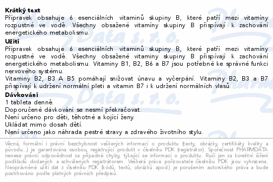 Přípravek obsahuje 6 esenciálních vitaminů skupiny B, které patří mezi vitamíny rozpustné ve vodě. Všechny obsažené vitamíny skupiny B přispívají k zachování energetického metabolismu.