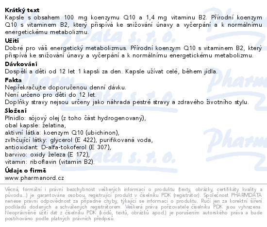 Kapsle s obsahem 100 mg koenzymu Q10 a 1,4 mg vitaminu B2. Přírodní koenzym Q10 s vitaminem B2, který přispívá ke snižování únavy a vyčerpání a k normálnímu energetickému metabolizmu.