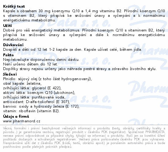 Kapsle s obsahem 30 mg koenzymu Q10 a 1,4 mg vitaminu B2. Přírodní koenzym Q10 s vitaminem B2, který přispívá ke snižování únavy a vyčerpání a k normálnímu energetickému metabolizmu.
