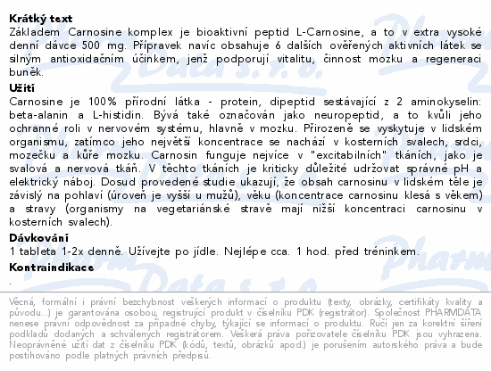 Základem Carnosine komplex je bioaktivní peptid L-Carnosine, a to v extra vysoké denní dávce 500 mg. Přípravek navíc obsahuje 6 dalších ověřených aktivních látek se silným antioxidačním účinkem, jenž podporují vitalitu, činnost mozku a regeneraci buněk.