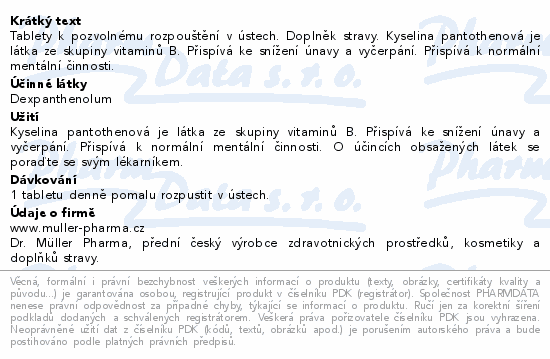 Tablety k pozvolnému rozpouštění v ústech. Doplněk stravy. Kyselina pantothenová je látka ze skupiny vitaminů B. Přispívá ke snížení únavy a vyčerpání. Přispívá k normální mentální činnosti.