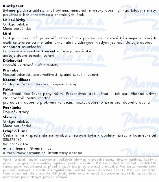 Bylinné polykací tablety, chuť bylinná, mimořádně vysoký obsah ginkgo biloby a macy peruánské, bez konzervace a chemických látek.