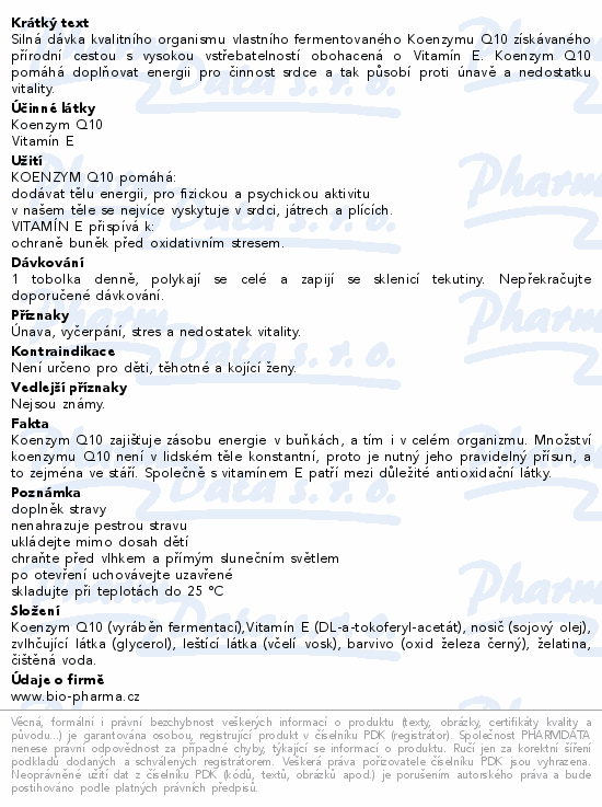 Silná dávka kvalitního organismu vlastního fermentovaného Koenzymu Q10 získávaného přírodní cestou s vysokou vstřebatelností obohacená o Vitamín E. Koenzym Q10 pomáhá doplňovat energii pro činnost srdce a tak působí proti únavě a nedostatku vitality.