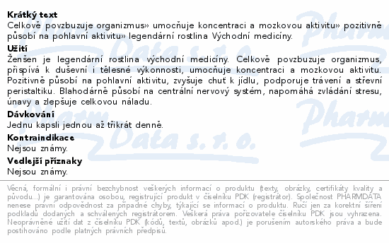 Celkově povzbuzuje organizmus» umocňuje koncentraci a mozkovou aktivitu» pozitivně působí na pohlavní aktivitu» legendární rostlina Východní medicíny.