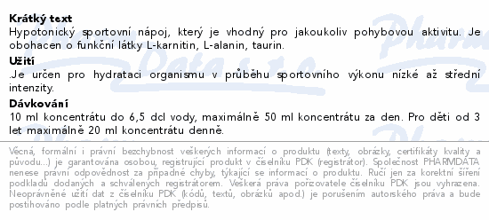 Hypotonický sportovní nápoj, který je vhodný pro jakoukoliv pohybovou aktivitu. Je obohacen o funkční látky L-karnitin, L-alanin, taurin.