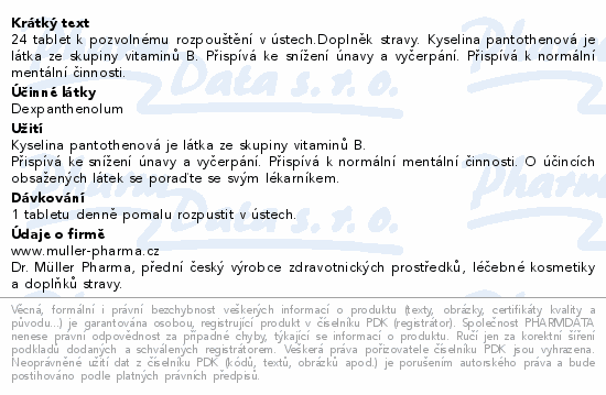 24 tablet k pozvolnému rozpouštění v ústech.Doplněk stravy. Kyselina pantothenová je látka ze skupiny vitaminů B. Přispívá ke snížení únavy a vyčerpání. Přispívá k normální mentální činnosti.