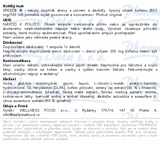SPEED8 ® – tekutý doplněk stravy s cukrem a sladidly. Vysoký obsah kofeinu (825 mg/100 ml) pomáhá zvýšit pozornost a koncentraci. Příchuť original.