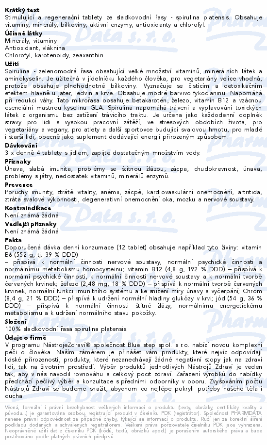 Stimulující a regenerační tablety ze sladkovodní řasy - spirulina platensis. Obsahuje vitaminy, minerály, bílkoviny, aktivní enzymy, antioxidanty a chlorofyl.