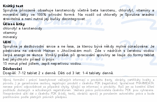 Spirulina přirozeně obsahuje karotenoidy včetně beta karotenu, chlorofyl, vitamíny a minerální látky ve 100% přírodní formě. Na rozdíl od chlorelly je Spirulina snadno stravitelná a není nutné její buňky dezintegrovat.
