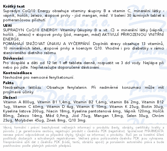 Supradyn CoQ10 Energy obsahuje vitaminy skupiny B a vitamin C, minerální látky - vápník, hořčík, železo, stopové prvky - jód mangan, měď. V balení 30 šumivých tablet s pomerančovou příchutí.