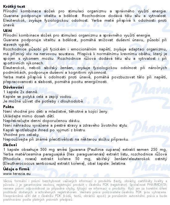 Přírodní kombinace složek pro stimulaci organizmu a správného využití energie. Guarana podporuje vitalitu a bdělost. Rozchodnice dodává tělu sílu a vytrvalost. Eleuterokok, zvyšuje fyziologickou odolnost. Yerba maté přispívá k odolnosti proti únavě.