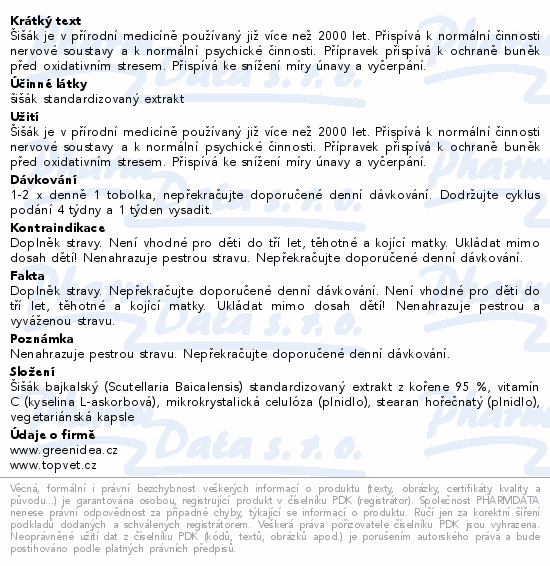 Šišák je v přírodní medicíně používaný již více než 2000 let. Přispívá k normální činnosti nervové soustavy a k normální psychické činnosti. Přípravek přispívá k ochraně buněk před oxidativním stresem. Přispívá ke snížení míry únavy a vyčerpání.