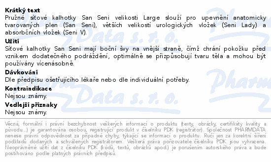 Pružné síťové kalhotky San Seni velikosti Large slouží pro upevnění anatomicky tvarovaných plen (San Seni), větších velikostí urologických vložek (Seni Lady) a absorbčních vložek (Seni V).