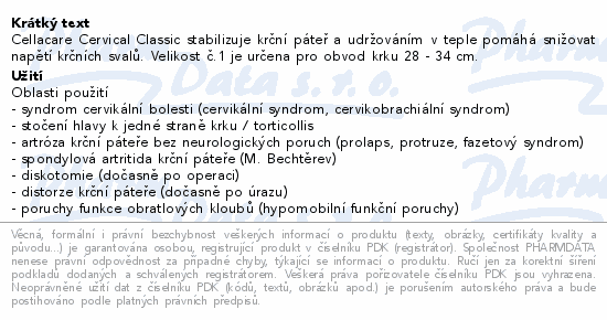 Cellacare Cervical Classic stabilizuje krční páteř a udržováním v teple pomáhá snižovat napětí krčních svalů. Velikost č.1 je určena pro obvod krku 28 - 34 cm.