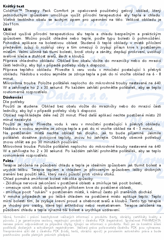 ColdHot™ Therapy Pack Comfort je opakovaně použitelný gelový obklad, který jednoduchým způsobem umožňuje využít přírodní terapeutické síly tepla a chladu. Včetně textilního obalu se suchým zipem pro upevnění na tělo. Velikost obkladu je 26x11cm.