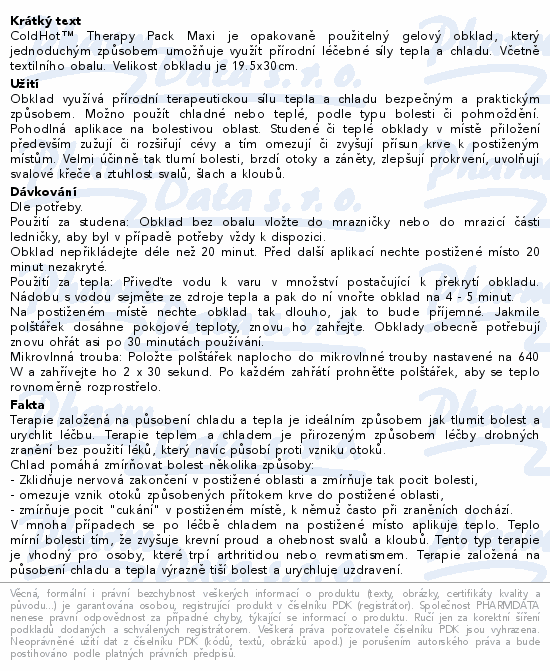 ColdHot™ Therapy Pack Maxi je opakovaně použitelný gelový obklad, který jednoduchým způsobem umožňuje využít přírodní léčebné síly tepla a chladu. Včetně textilního obalu. Velikost obkladu je 19.5x30cm.