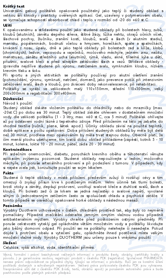 Univerzální gelový polštářek opakovaně použitelný jako teplý či studený obklad s velikou šíří klinicky i prakticky ověřených aplikací. Gel, uzavřený v polymerovém obalu, se vyznačuje schopností absorbovat chlad i teplo v rozmězí od -20 do +60 st.C.