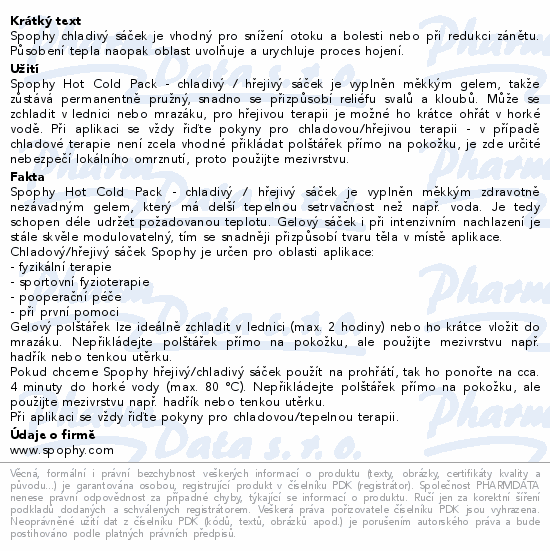 Spophy chladivý/hřejivý sáček je praktická zdravotnická pomůcka určená pro lokální terapii chladem nebo teplem. Je vhodný pro opakované použití a díky své univerzální velikosti se snadno přikládá na různé části těla – například klouby, svaly, šíji nebo oblast zad.