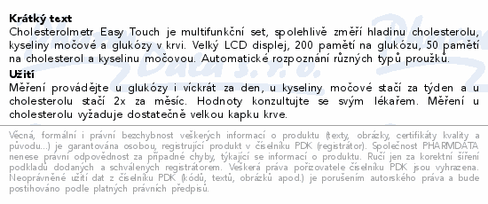 Cholesterolmetr Easy Touch je multifunkční set, spolehlivě změří hladinu cholesterolu, kyseliny močové a glukózy v krvi. Velký LCD displej, 200 pamětí na glukózu, 50 pamětí na cholesterol a kyselinu močovou. Automatické rozpoznání různých typů proužků.
