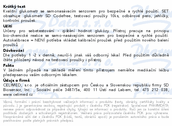 Kvalitní glukometr se samonasávacím senzorem pro bezpečné a rychlé použití. SET obsahuje: glukometr SD Codefree, testovací proužky 10ks, odběrové pero, jehličky, kontrolní proužek.