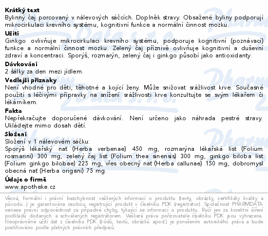 Bylinný čaj porcovaný v nálevových sáčcích. Doplněk stravy. Obsažené byliny podporují mikrocirkulaci krevního systému, kognitivní funkce a normální činnost mozku.