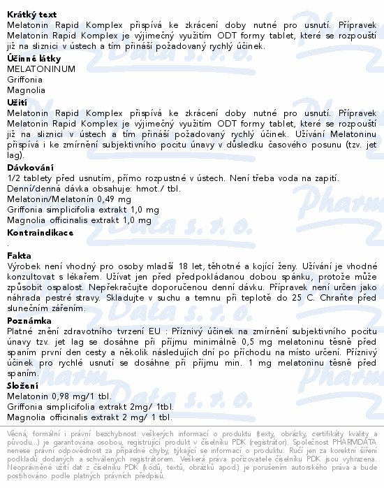 Melatonin Rapid Komplex přispívá ke zkrácení doby nutné pro usnutí. Přípravek Melatonin Rapid Komplex je výjimečný využitím ODT formy tablet, které se rozpouští již na sliznici v ústech a tím přináší požadovaný rychlý účinek.
