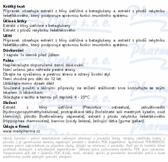 Přípravek obsahuje extrakt z hlívy ústřičné s betaglukany a extrakt z plodů rakytníku řešetlákového, který podporuje správnou funkci imunitního systému.