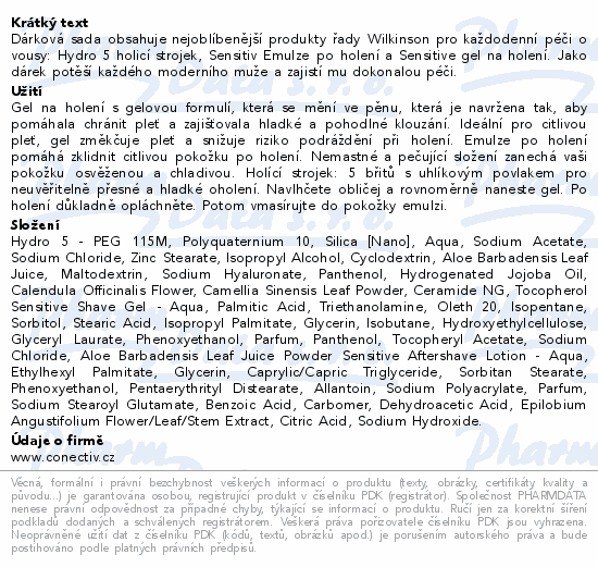 Dárková sada obsahuje nejoblíbenější produkty řady Wilkinson pro každodenní péči o vousy: Hydro 5 holicí strojek, Sensitiv Emulze po holení a Sensitive gel na holení. Jako dárek potěší každého moderního muže a zajistí mu dokonalou péči.