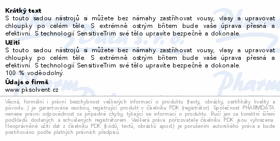 S touto sadou nástrojů si můžete bez námahy zastřihovat vousy, vlasy a upravovat chloupky po celém těle. S extrémně ostrým břitem bude vaše úprava přesná a efektivní. S technologií SensitiveTrim své tělo upravíte bezpečně a dokonale.