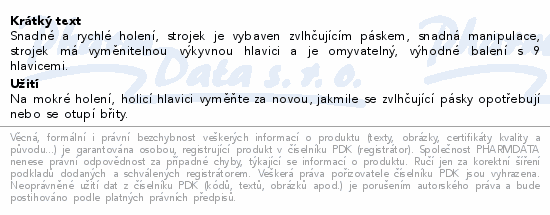 Snadné a rychlé holení, strojek je vybaven zvlhčujícím páskem, snadná manipulace, strojek má vyměnitelnou výkyvnou hlavici a je omyvatelný, výhodné balení s 9 hlavicemi.