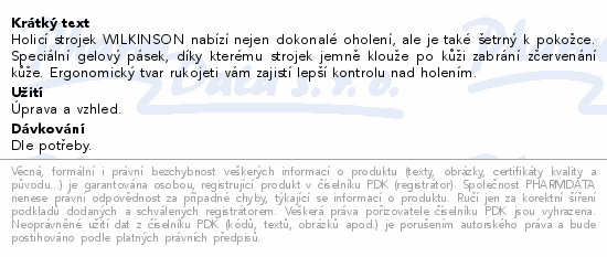 Holicí strojek WILKINSON nabízí nejen dokonalé oholení, ale je také šetrný k pokožce. Speciální gelový pásek, díky kterému strojek jemně klouže po kůži zabrání zčervenání kůže. Ergonomický tvar rukojeti vám zajistí lepší kontrolu nad holením.