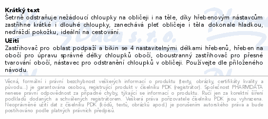 Šetrně odstraňuje nežádoucí chloupky na obličeji i na těle, díky hřebenovým nástavcům zastřihne krátké i dlouhé chloupky, zanechává pleť obličeje i těla dokonale hladkou, nedráždí pokožku, ideální na cestování.