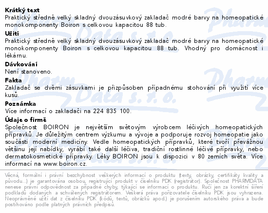 Praktický středně velký skladný dvouzásuvkový zakladač modré barvy na homeopatické monokomponenty Boiron s celkovou kapacitou 88 tub.