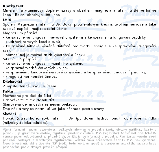 Minerální a vitamínový doplněk stravy s obsahem magnézia a vitamínu B6 ve formě kapslí. Balení obsahuje 100 kapslí.