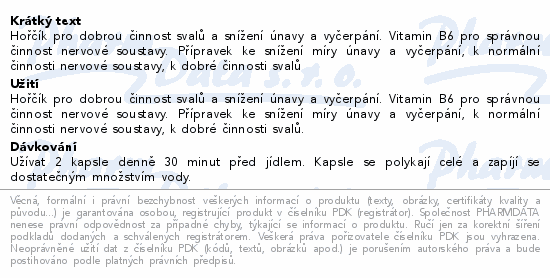Hořčík pro dobrou činnost svalů a snížení únavy a vyčerpání. Vitamin B6 pro správnou činnost nervové soustavy. Přípravek ke snížení míry únavy a vyčerpání, k normální činnosti nervové soustavy, k dobré činnosti svalů