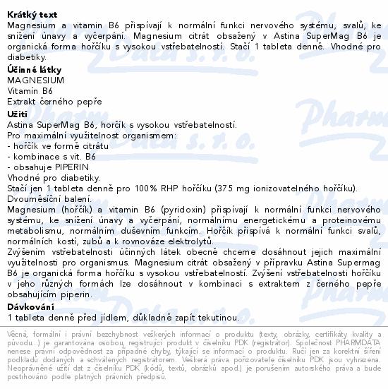 Magnesium a vitamin B6 přispívají k normální funkci nervového systému, svalů, ke snížení únavy a vyčerpání. Magnesium citrát obsažený v Astina SuperMag B6 je organická forma hořčíku s vysokou vstřebatelností. Stačí 1 tableta denně. Vhodné pro diabetiky.