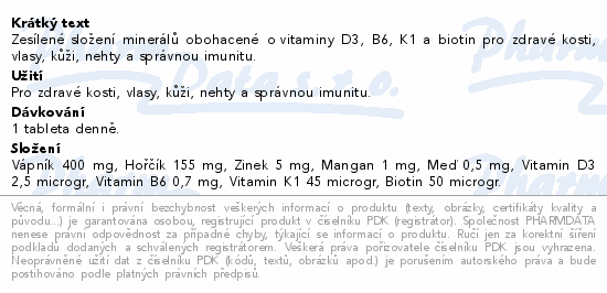 Zesílené složení minerálů obohacené o vitaminy D3, B6, K1 a biotin pro zdravé kosti, vlasy, kůži, nehty a správnou imunitu.