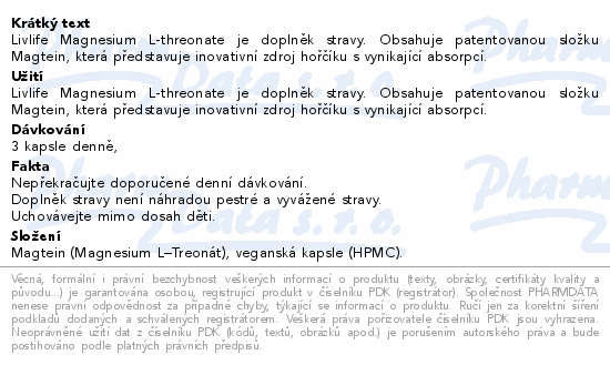 Livlife Magnesium L-threonate je doplněk stravy. Obsahuje patentovanou složku Magtein, která představuje inovativní zdroj hořčíku s vynikající absorpcí.