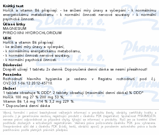 Hořčík a vitamin B6 přispívají: - ke snížení míry únavy a vyčerpání - k normálnímu energetickému metabolismu - k normální činnosti nervové soustavy - k normální psychické činnosti.
