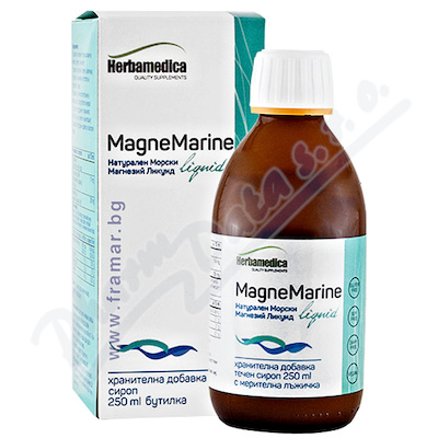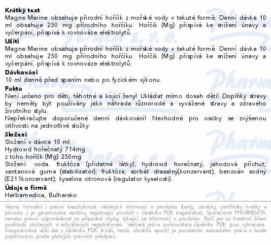 Magne Marine obsahuje přirodní hořčík z mořské vody v tekuté formě. Denní dávka 10 ml obsahuje 250 mg přírodního hořčíku. Hořčík (Mg) přispívá ke snížení únavy a vyčerpání, přispívá k rovnováze elektrolytů.